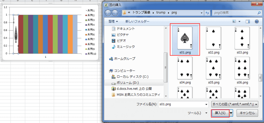 縦棒ブラフの系列が重なって表示されるのを利用する方法で、系列を指定することでグラフ上の画像が切り替えるといった方法です。