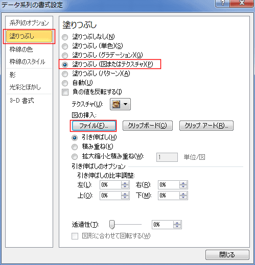 - 「塗りつぶし」を選択して、「塗りつぶし(図またはテクスチャ)」にチェックを入れます。
