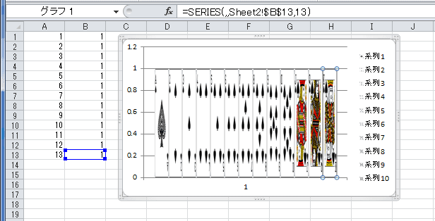 - 「系列2」〜[系列13」も同様に、5〜7の操作を繰り返して画像で塗りつぶします。
