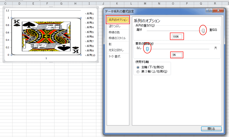 - [系列のオプション]を選択して、系列の重なりを 100%、要素の間隔を 0% にします。