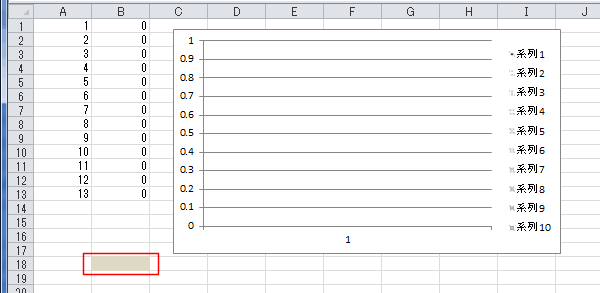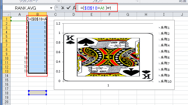 - B1:B13セルを選択して、数式バーに =($B$18=A1)*1 と入力して、[Ctrl]+[Enter]で選択範囲すべてに数式を入力します。