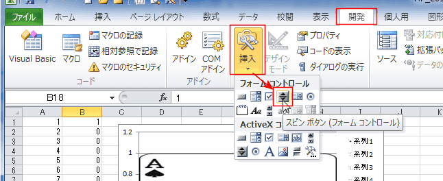 - [開発]タブの[挿入]→[スピンボタン(フォームコントロール)]をクリックします。
