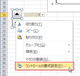 - スピンボタンを右クリックして、[コントロールの書式設定]を選択します。