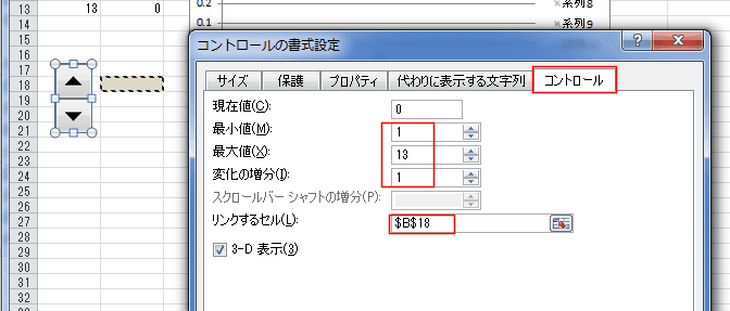 - [コントロール]タブを選択して、リンクするセルに B18 セルを指定します。