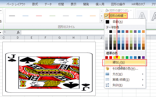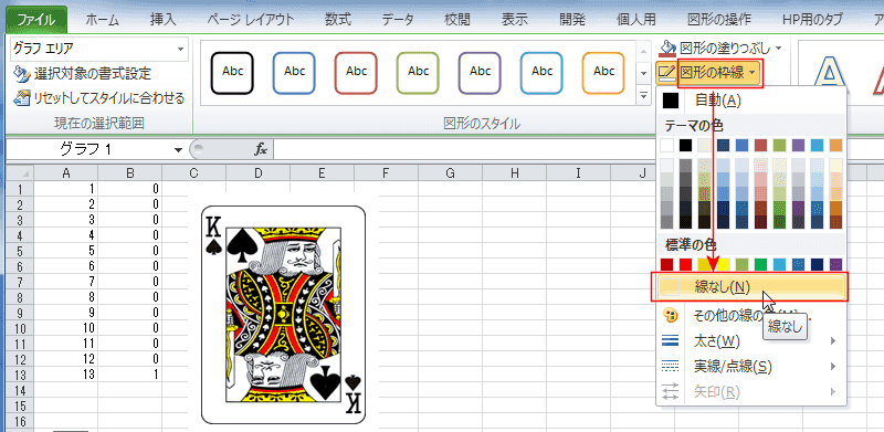 - グラフツール リボンの[書式]タブの[図形の枠線]→[線なし]を選択します。