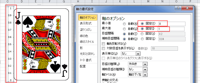 - 縦(値)軸をダブルクリックして、「軸のオプション」で最小値 を0 、最大値を 1 に設定します。