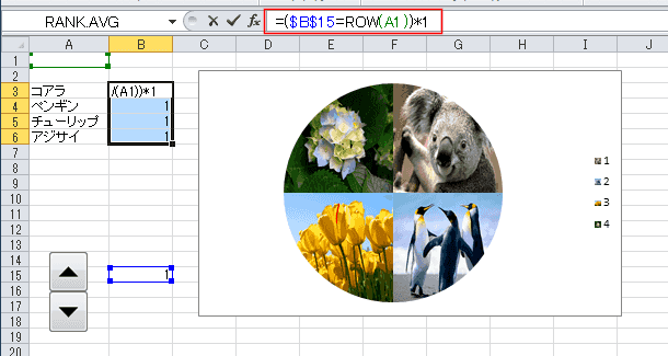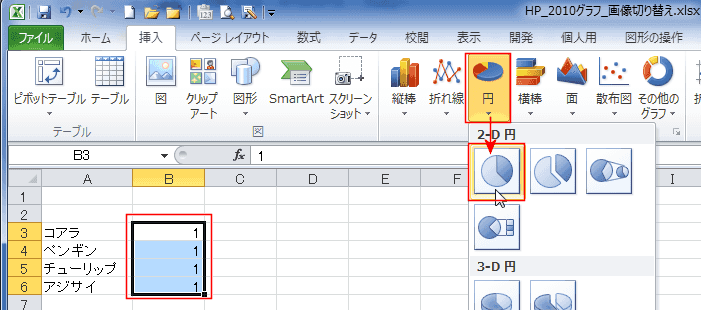 よねさんのExcelとWordの使い方|エクセル2010基本講座:目次|グラフの使い方|図(写真や画像)や図形の操作|グラフを利用して画像を切り替える(円グラフ)