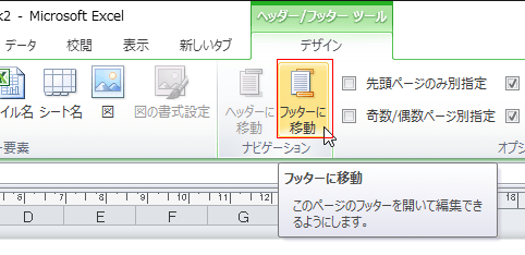 フッターを編集したいときは[ヘッダー/フッター ツール]リボンの[デザイン]タブの[フッターに移動]をクリックします。
