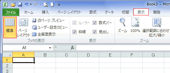 [表示]タブの「ブックの表示」グループの[標準]を実行すると、標準の表示モードに戻ります。