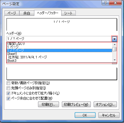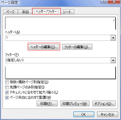 [ページ設定]ダイアログの[ヘッダー/フッター]タブを選択します。