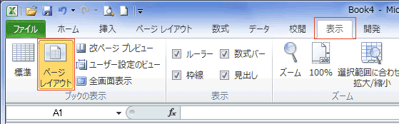 [表示]タブの「ブックの表示」グループにある[ページレイアウト]を実行します。