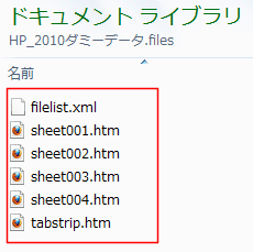 - ちなみに、HP_2010ダミーデータ.files というフォルダーには各シートごとのファイルが作成されているのが確認できます。