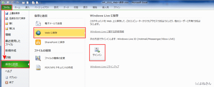よねさんのExcelとWordの使い方|エクセル2010基本講座:目次|Excel(エクセル)のバックステージ ビューの使い方|Web(SkyDrive/OneDrive)に保存する