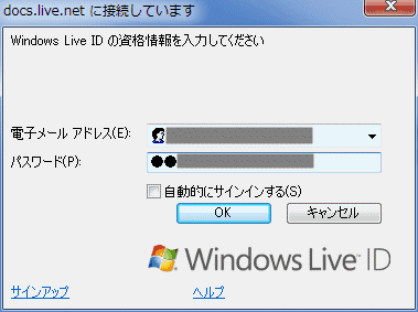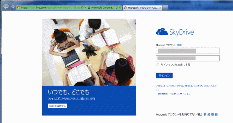 - ブラウザ(IE)を使って、SkyDriveへ接続してみます。
