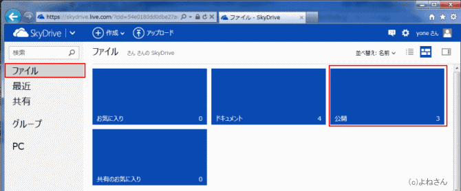 - SkyDriveへ接続されました。[ファイル]を選択すると各フォルダ(場所)が表示されした。