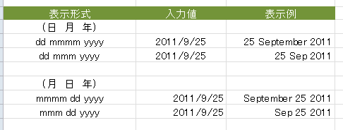 | mmm | Jul | 月名が英語の省略形で表示されます。 Jan〜Dec |