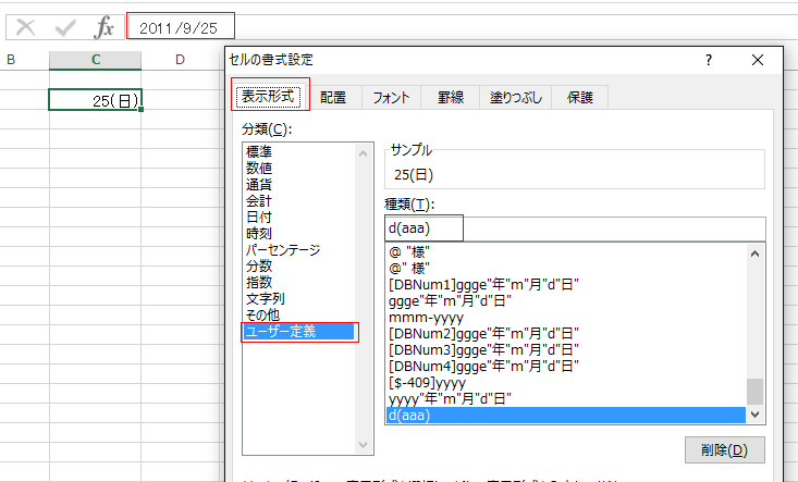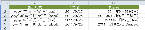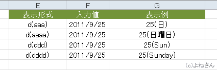 | d | 2004/7/8 | ddd | Thu | 曜日が英語の省略形で表示されます。 Sun〜Sat |