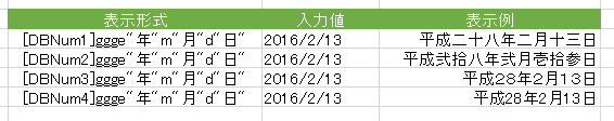 | 書式記号 | 入力値 | 設定例 | 表示例 | 説 明 |