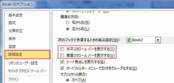 - [詳細設定]を選択し、次のブックで作業するときの表示設定で「水平スクロールバーを表示する」「垂直スクロールバーを表示する」のチェックをオン/オフにします。