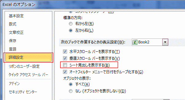 - [詳細設定]を選択し、次のブックで作業するときの表示設定で「シート見出しを表示する」のチェックをオン/オフにします。