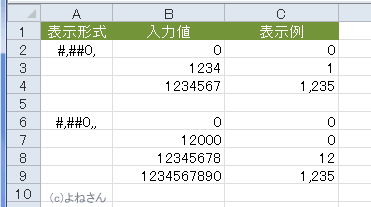 数値の桁を区切ります(1000単位)。 後につけると、数値を 1000 で割って小数部は四捨五入して表示されます。 |