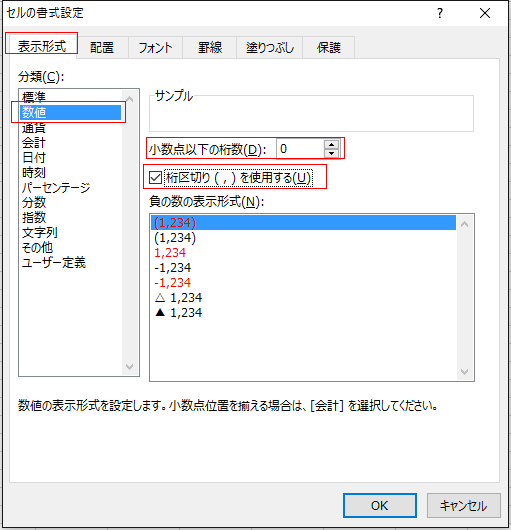 | [ ] | 123 | [赤]#,### | 123 | 色の名前 (8 色) を指定して、文字色を指定します。 黒、青、水、緑、紫、赤、白、黄 が使用できます。 |