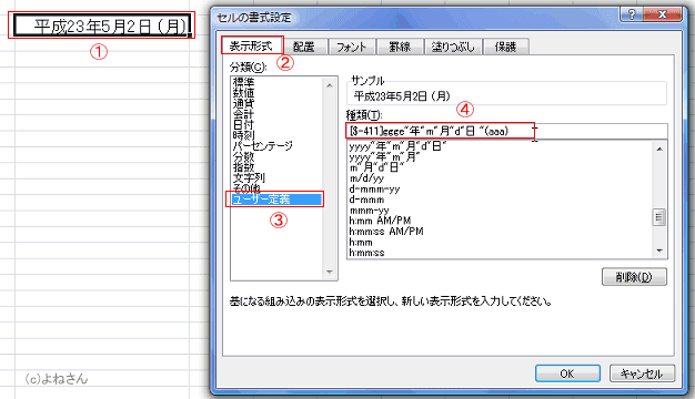 | e | 1994/7/8 | ggge | 平成6 | 年が1桁表示になります。 |