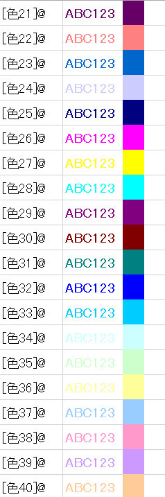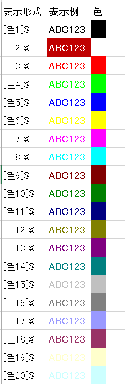 | 123 | [色4]#,### | 123 | カラーパレットの色を指定します。nは1〜56 | |