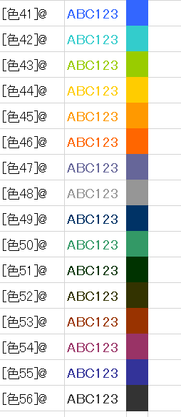 | Sub Macro1() Dim i As Long For i = 1 To 56 Cells(i + 1, 1).Value = "[色" & i & "]@" Cells(i + 1, 1).NumberFormatLocal = "[色1]@" Cells(i + 1, 2).Value = "ABC123" Cells(i + 1, 2).NumberFormatLocal = "[色" & i & "]@" Cells(i + 1, 3).Interior.ColorIndex = i Next i End Sub |