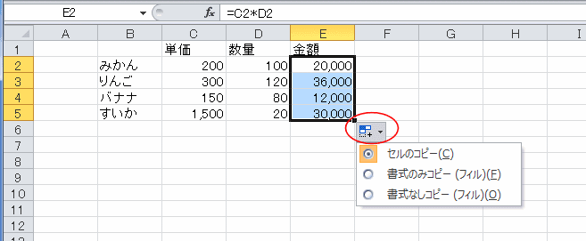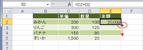 E2セルを選択して、フィルハンドルをドラッグします。