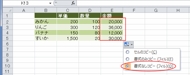 オートフィル オプションの「書式なしコピー(フィル)」を選択します。