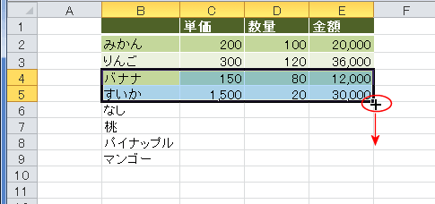 書式を設定したいので、B4:E5を選択して、フィルハンドルをドラッグします。