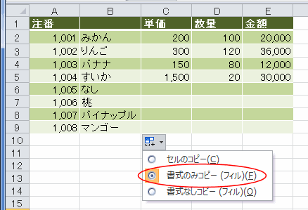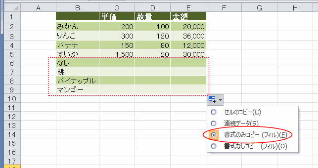 オートフィル オプションの「書式のみコピー(フィル)」を選択します。