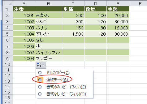 オートフィル オプションの「連続データ」を選択します。