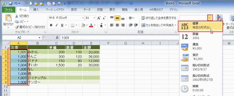 A2:A9セルを選択して、[ホーム]タブの表示形式で「標準」を選択します。