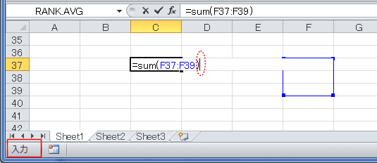 - 数式の入力途中で、関数の引数が入力される場面で、カーソルキーを押すと参照モードになり、セル範囲が入力されます。