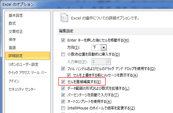 [詳細設定]を選択して、「セルを直接編集する」にチェックが入っているか確認してください。