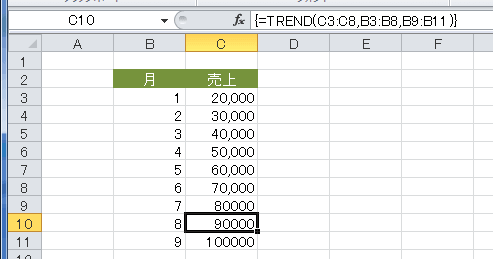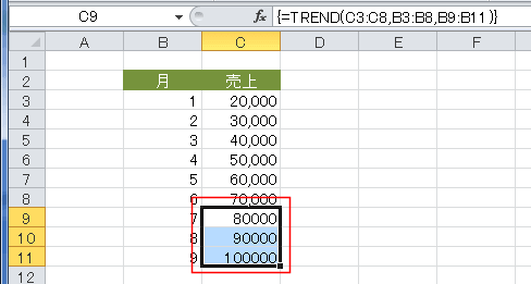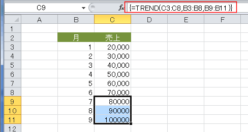 この売り上げの予測をする計算を、C9:C11セルを選択して、=TREND(C3:C8,B3:B8,B9:B11) と入力し、[Ctrl]+[Shift]+[Enter]で配列数式としています。
