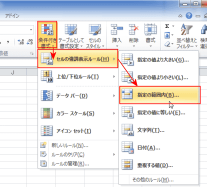 - [ホーム]タブの[スタイル]グループで[条件付き書式]→[セルの強調表示ルール]→[指定の範囲内]を実行します。