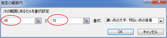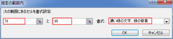 - 下図の例の場合は70以上、95以下のセルに書式が設定されます。