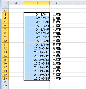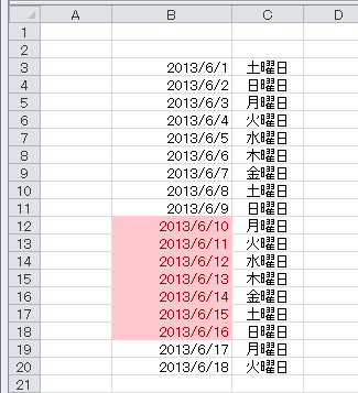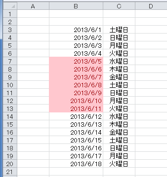 - 現在の日付「2013/6/11」を含む7日間のセルに指定した書式が設定されました。