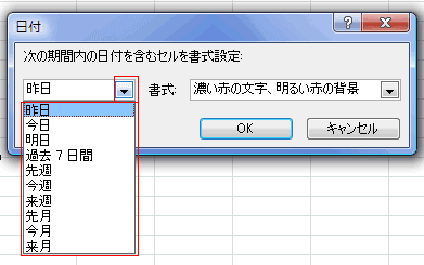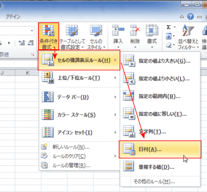 - [ホーム]タブの[スタイル]グループで[条件付き書式]→[セルの強調表示ルール]→[日付]を実行します。