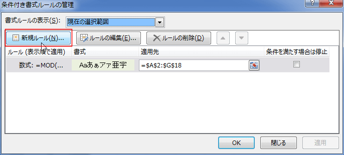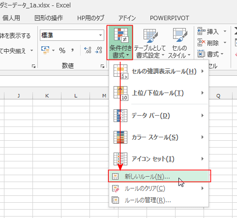 - [ホーム]タブの[条件付き書式]→[新しいルール]を実行します。
