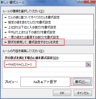 次の数式を満たす場合に値を書式設定 で =MOD(ROW(),2)=1 と入力しました。