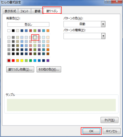 [書式]ボタンをクリックして、塗りつぶしの色を設定しました。