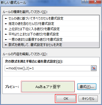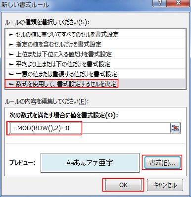 次の数式を満たす場合に値を書式設定 で =MOD(ROW(),2)=0 と入力しました。