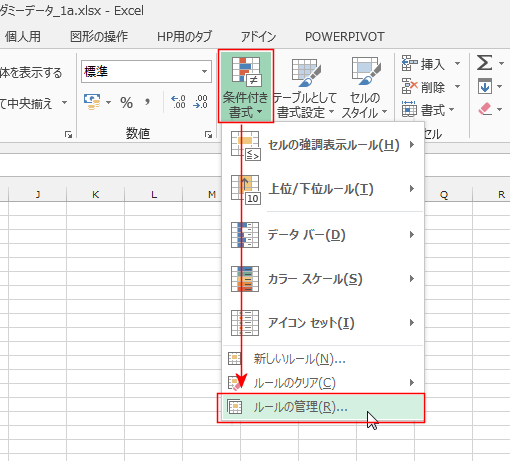 - [ホーム]タブの[条件付き書式]→[ルールの管理]を実行します。