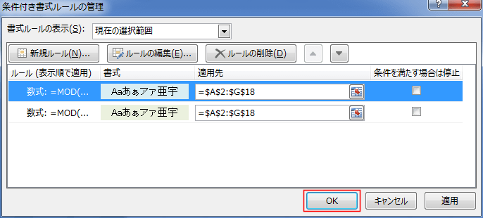 - 2つの条件付き書式が設定されました。[OK]ボタンをクリックします。