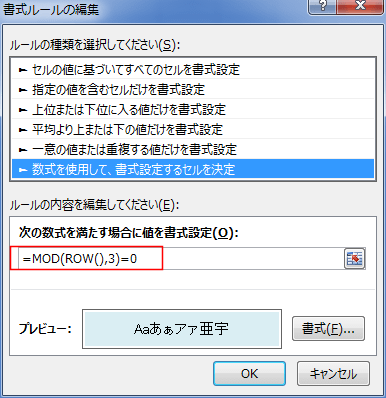 - 数式を =MOD(ROW(),3)=0 として書式を設定しました。