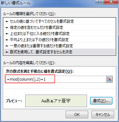 - 列番号は COLUMN() で得ることができますので、数式を =MOD(COLUMN(),2)=1 として、書式を設定します。